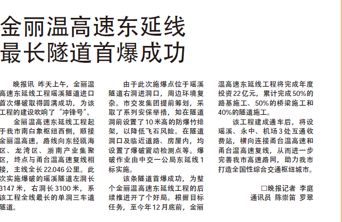 金丽温高速东延线最长隧道首爆成功