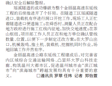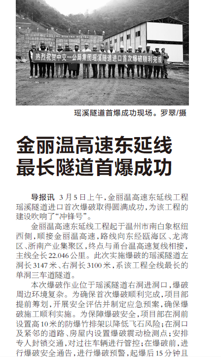 金丽温高速东延线最长隧道首爆成功