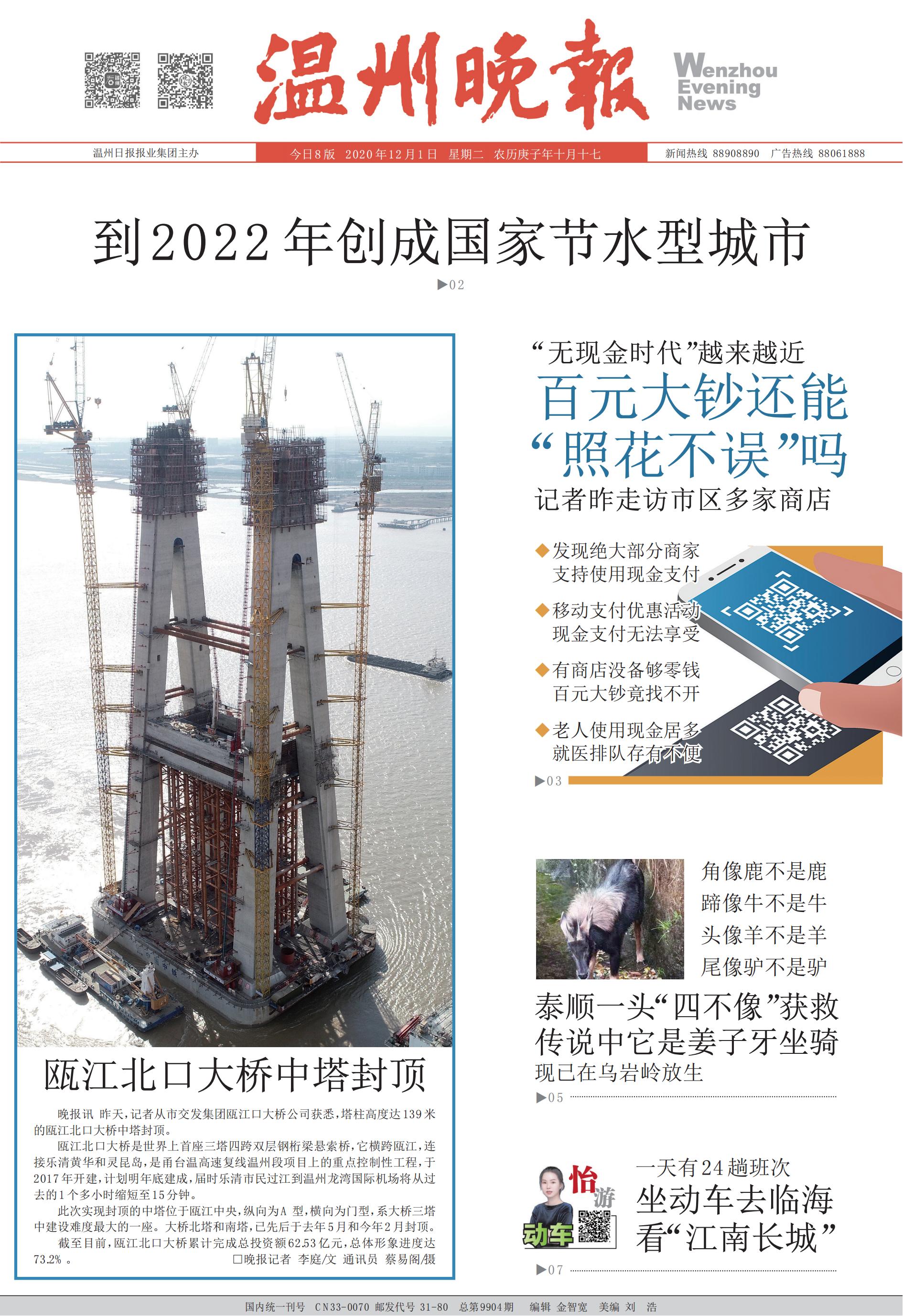 温州瓯江北口大桥中塔顺利封顶