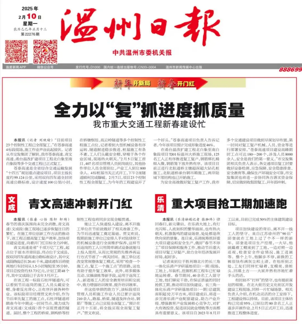 全力以“复”抓进度抓质量 温州重大交通工程新春建设忙