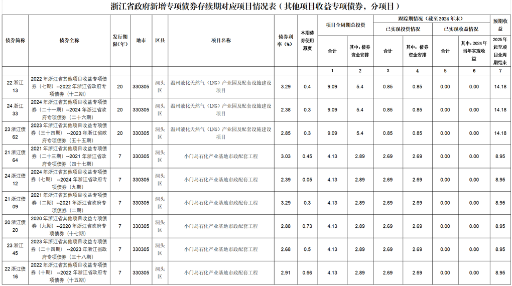 大小门岛公司关于浙江省政府新增专项债券存续期对应项目情况表