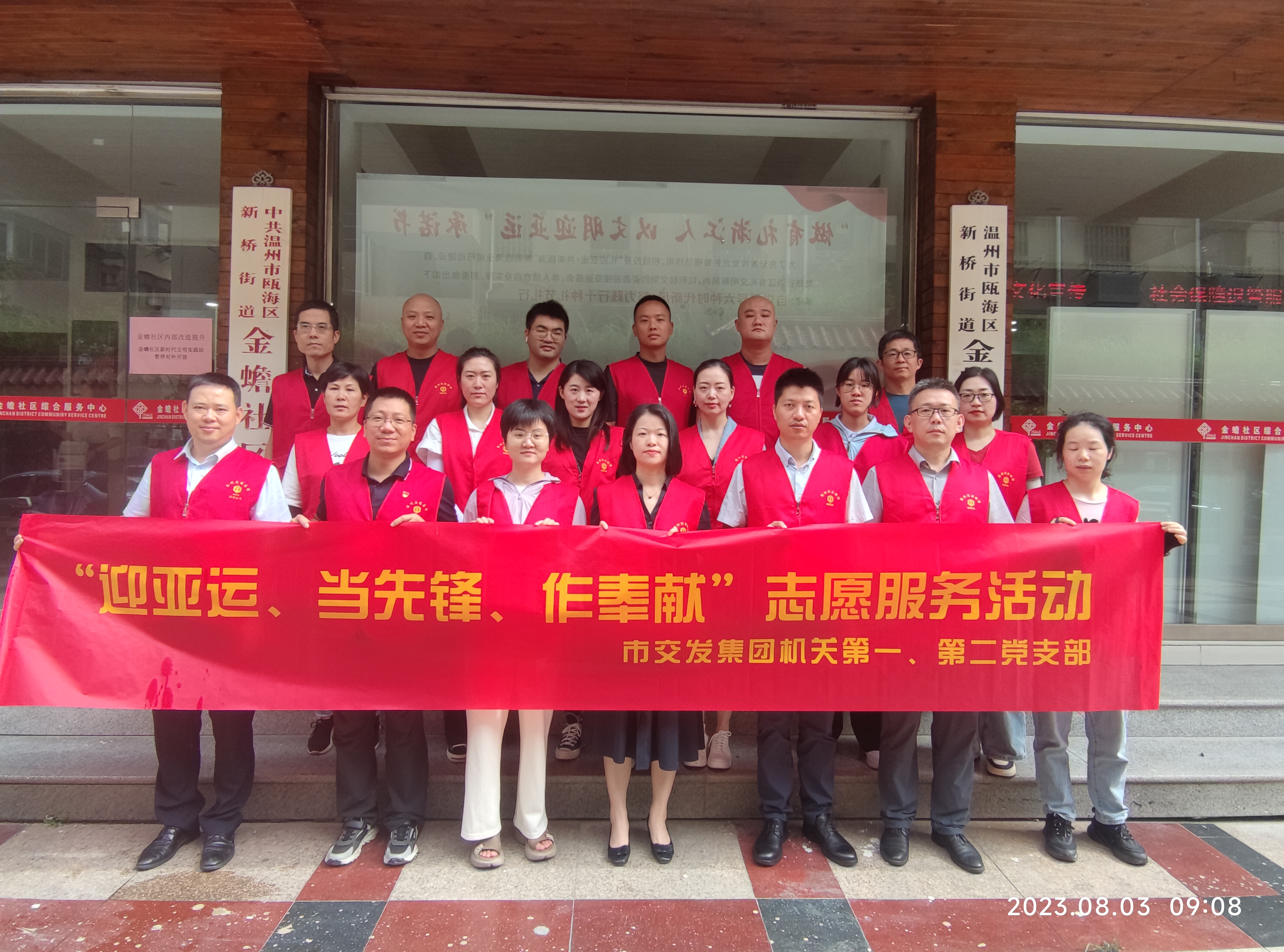 为进一步助力迎亚运盛会三大提升行动,推动形成支持亚运、参与亚运、服务亚运的浓厚氛围,8月3日上午,市交发集团机关第一、二党支部组织党员志愿者赴瓯海区新桥街道金蟾社区开展”迎亚运、当先锋、作奉献“志愿服务活动。